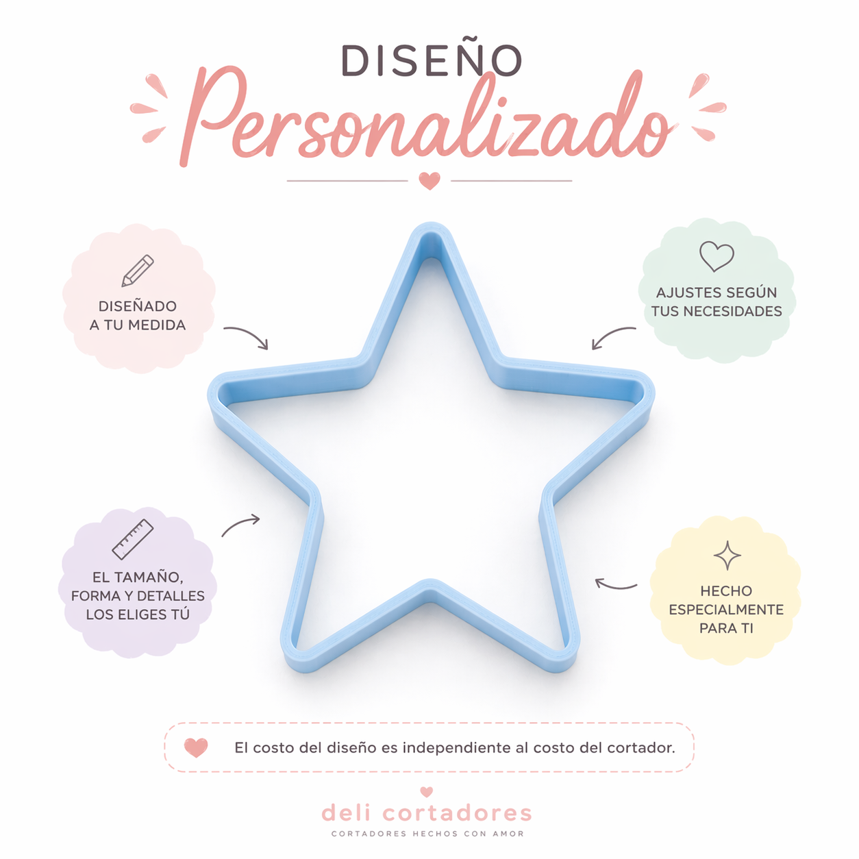 – El diseño personalizado se cobra en función del nivel de detalle del cortador, tiempo de elaboración, ajustes técnicos necesarios, tamaño del cortador y urgencia solicitada.